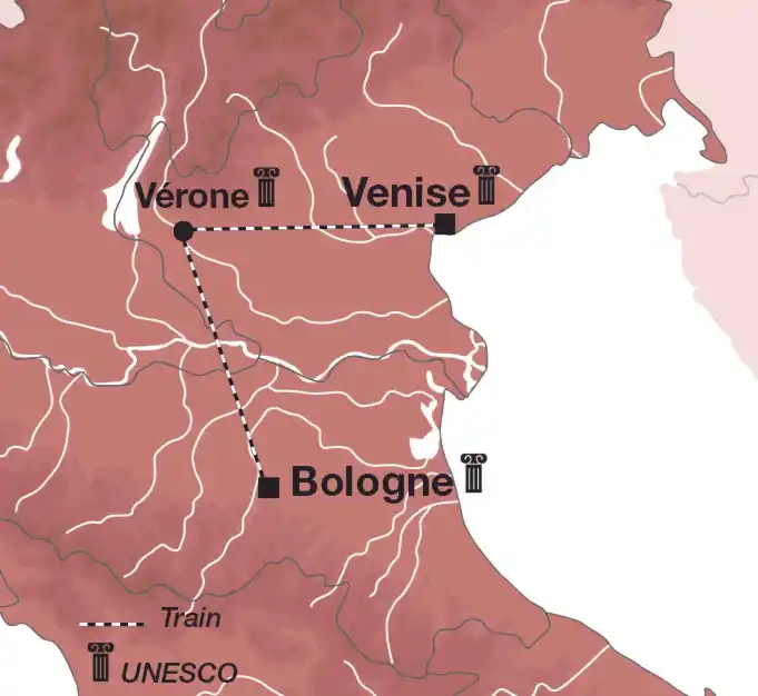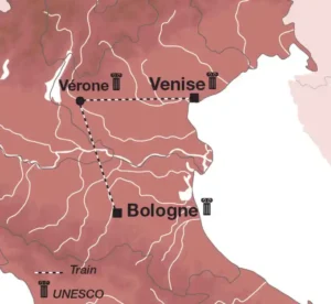 Au fil de cet itinéraire en train, découvrez trois bijoux culturels : Bologne, la médiévale, Vérone, la romantique et Venise, la Sérenissime. Plongez dans l’histoire flamboyante de ces villes et profitez des trajets en train pour voir défiler les paysages de terres fertiles de produits qui font la renommée gastronomique de ces régions.