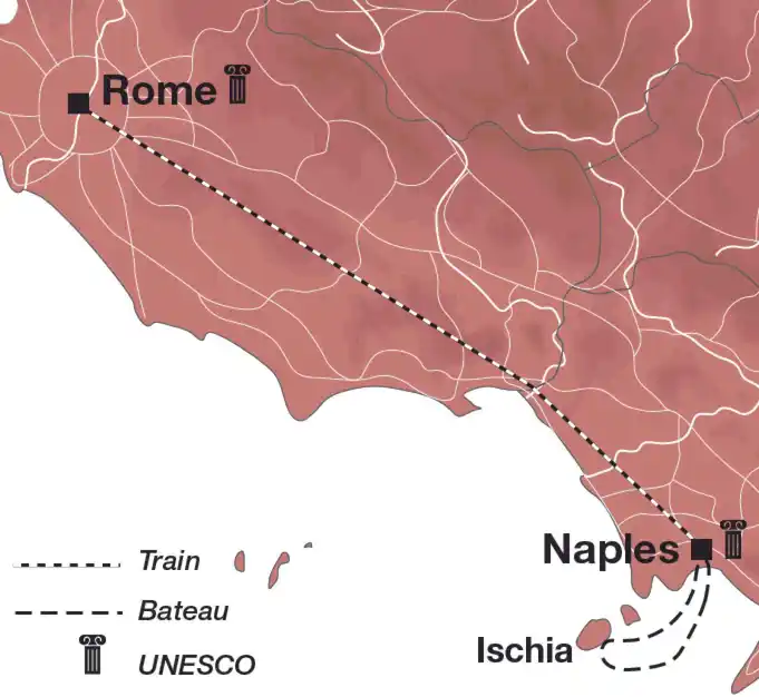 - Les hôtels sélectionnés pour ce programme sont situés à distance pédestre de la gare de Rome et du port de Naples (ou la gare de Naples). Celui prévu à Ischia est situé à 1 km du port (transferts inclus).