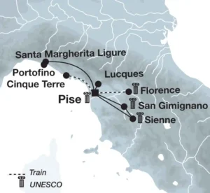 - Visite du 7e jour : les groupes de 30 personnes et plus prendront le bateau depuis Rapallo vers Santa Margherita Ligure puis vers Portofino et reviendront par bateau à Rapallo avant de retrouver le bus pour le trajet retour vers Pise. En cas de suspension de navigation, ces 2 visites seront remplacées par Rapallo et Sestri Levante.