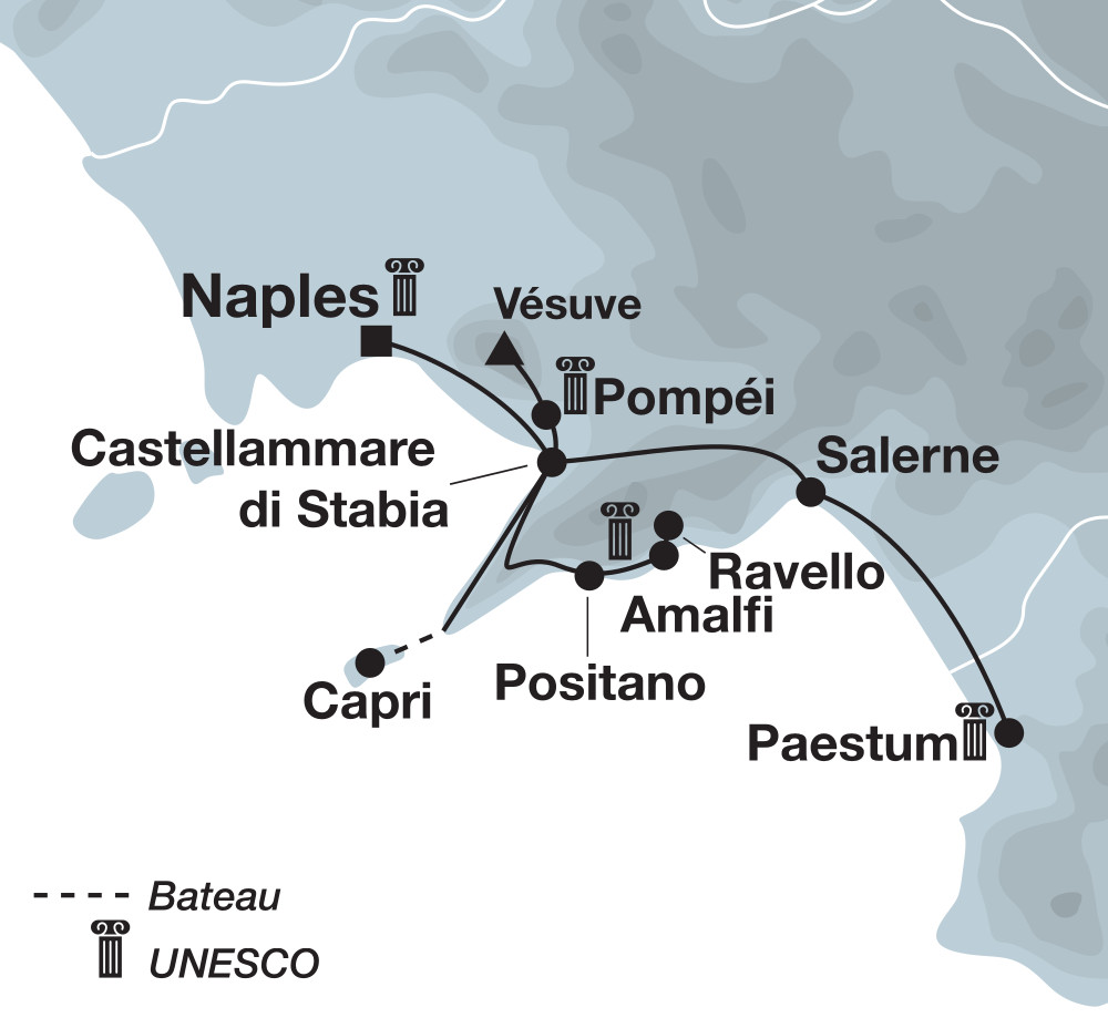 - Tarifs, par personne, des excursions en option à régler sur place donnés à titre indicatif : le 4e jour, 32 € pour la Grotte Bleue à Capri et 24 € pour la mini-croisière autour de l’île de Capri.