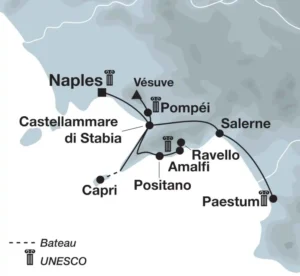 (vestiges des Ve et VIe siècle avant J.-C.) : la basilique, le temple de Neptune, le plus majestueux et le mieux conservé, le temple de Cérès, le forum, le musée et les fresques détachées de tombes datant du Ve siècle avant J.-C. Déjeuner en cours de visite. Retour à Castellammare di Stabia. Dîner et nuit à l’hôtel.