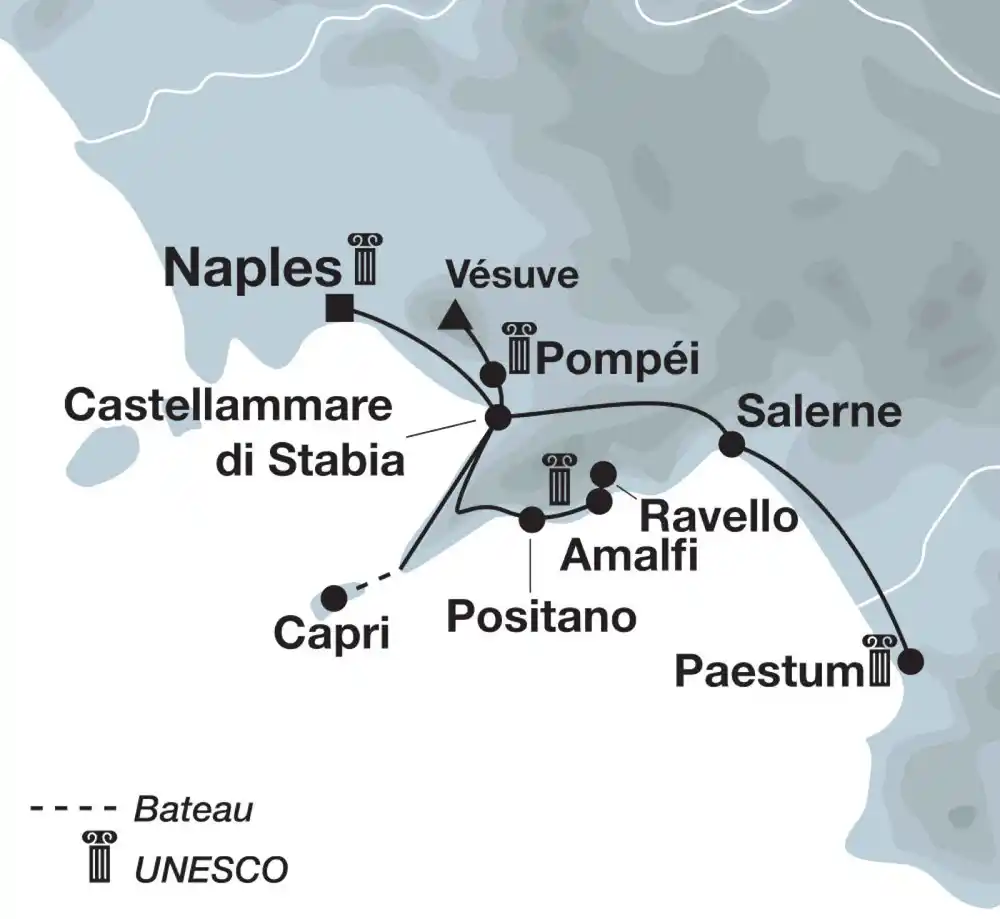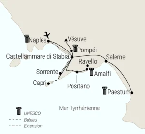 - Les dates en groupe standard, réservées à l’hôtel Stabia, offrent une vue ville ; possibilité de vue mer latérale ou de face avec différents suppléments, à partir de 45 € par personne pour le circuit.