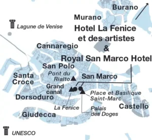 HOTEL LA FENICE ET DES ARTISTES *** sup Cet hôtel vintage, à quelques pas du théâtre La Fenice, accueille souvent des artistes qui apprécient l’authenticité et l’atmosphère familiale des lieux. Les 67 chambres, toutes personnalisées grâce au mobilier chiné, sont équipées du WiFi gratuit et d’un minibar. Salle de restauration où est servi le petit déjeuner continental, petit patio intérieur.