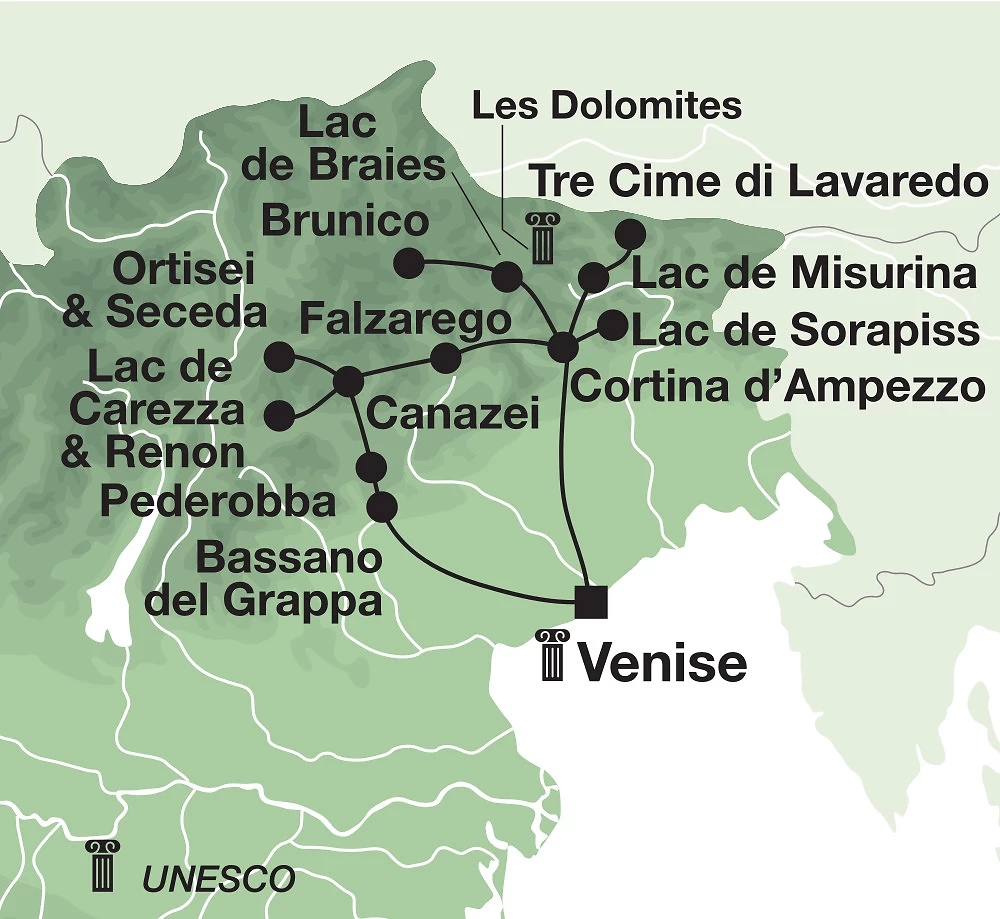 - La première étape de cet itinéraire est située à un peu plus de 150 km de l’aéroport de Venise-Marco Polo : nous vous conseillons de réserver un vol atterrissant au plus tard à 15 h afin de rejoindre tranquillement votre premier hôtel, après avoir pris en charge votre voiture. De même, la dernière étape est situé à 85 km du même aéroport, nous vous recommandons de ne pas prévoir de vol partant avant 13h00.