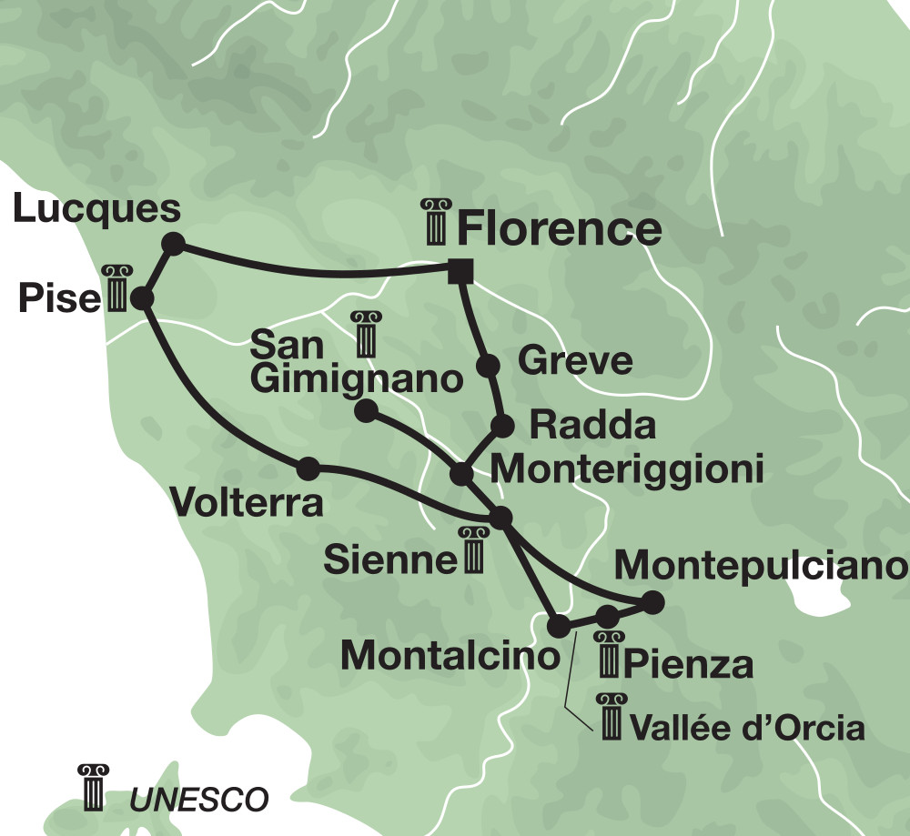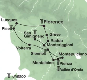 Vous traverserez la vallée du fleuve Orcia, rejoindrez Montepulciano, réputée pour son vin et ses palais. Continuation vers Pienza, fleuron de la Renaissance. Arrêt au village de Monticchiello, où le temps semble s’être arrêté au Moyen Âge et dont les habitants jouent, l’été, des scènes de la vie rurale. À San Quirico d’Orcia, la visite des jardins Horti Leonini du XVIe siècle est conseillée. Vous terminerez votre balade à Montalcino, dominée par une remarquable forteresse. Retour à Sienne en soirée. Nuit à l’hôtel.