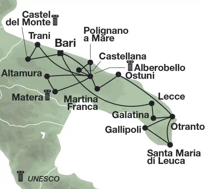 - La première étape de cet itinéraire est située à 70 km de l’aéroport de Bari et 75 km de Brindisi : nous vous conseillons de réserver un vol atterrissant au plus tard à 16 h afin de rejoindre tranquillement votre premier hôtel, après avoir pris en charge votre voiture.