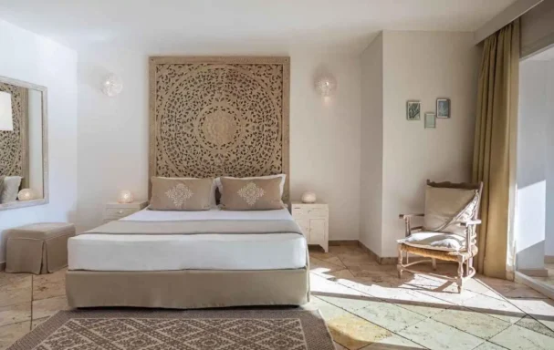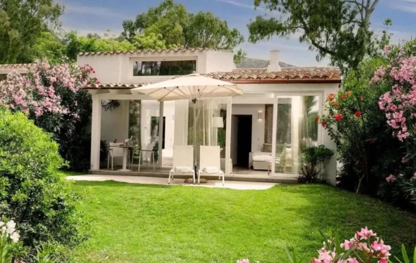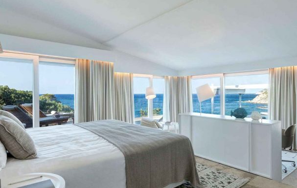 Plage privée de sable fin aménagée de transats et parasols (gratuits à partir de la 2e rangée).
