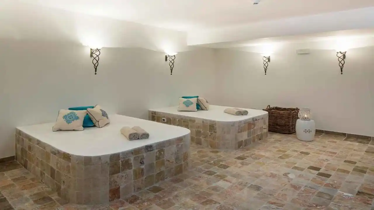 Accès libre à la piscine chauffée du Spa, sauna finlandais bio, hammam et bains à remous.