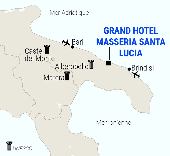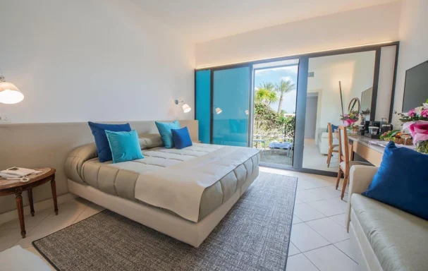 À 450 m. une petite plage de sable est partiellement réservée à la clientèle ; la pointe rocheuse adjacente est aménagée en espace de farniente sur pelouse et sable, avec transats et parasols à disposition des clients de l’hôtel sans supplément. Service de bar. Accès à la mer par échelle. Service de navette saisonnier en voiturette depuis l’hôtel.