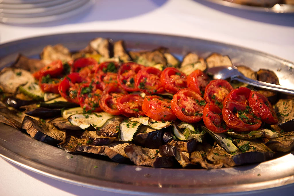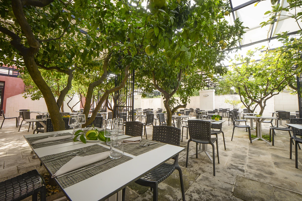 Le restaurant s'étire dans de beaux espaces intérieurs blanchis à la chaux et dans une ancienne orangeraie aménagée en terrasse ombragée des plus agréables. La cuisine puise son inspiration parmi les succulents produits locaux : huile d'olive, plus d'une centaine de pains différents, des pâtes fraîches et sèches, des fruits, légumes, viandes, vins et fromages du terroir. Bar à la réception.