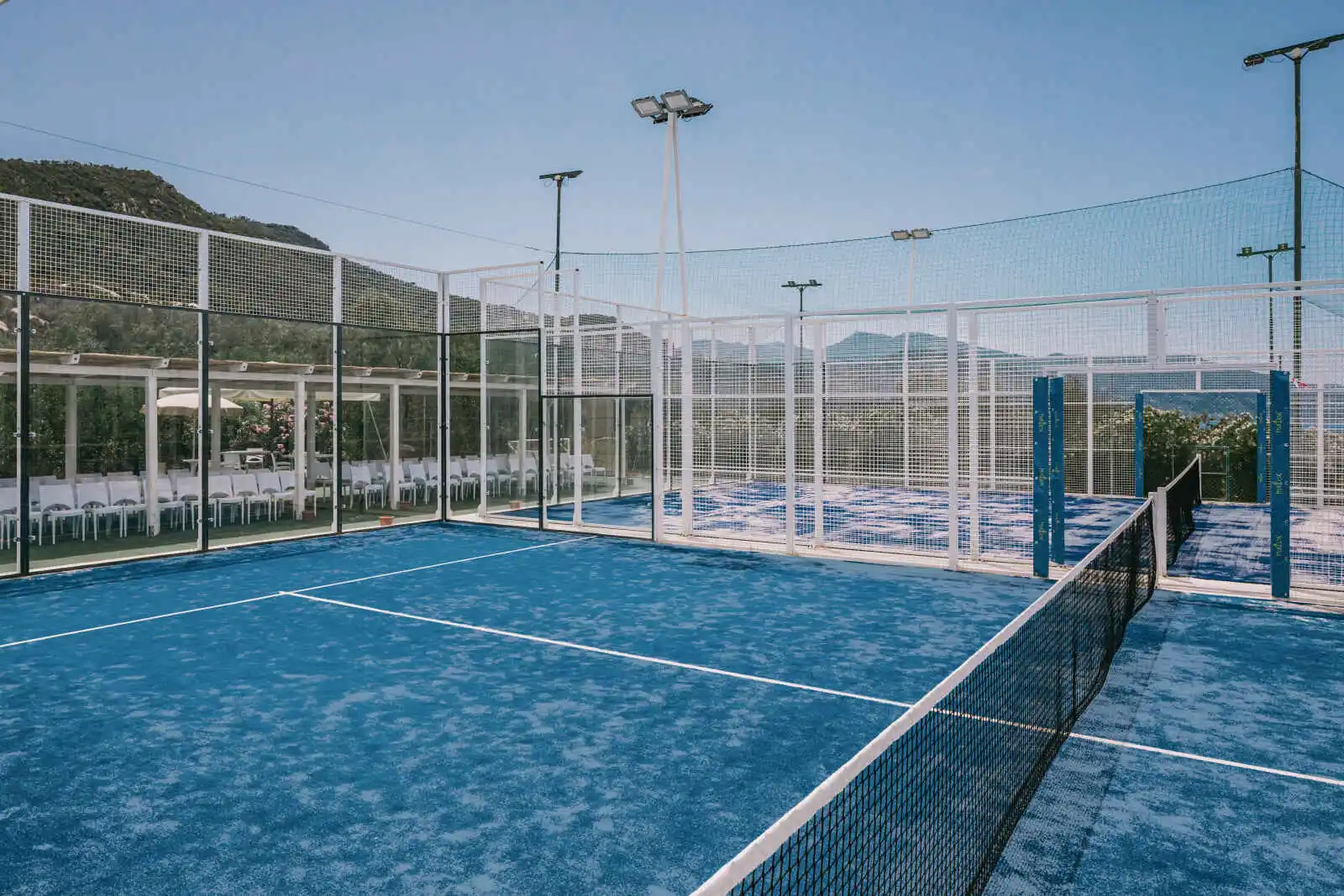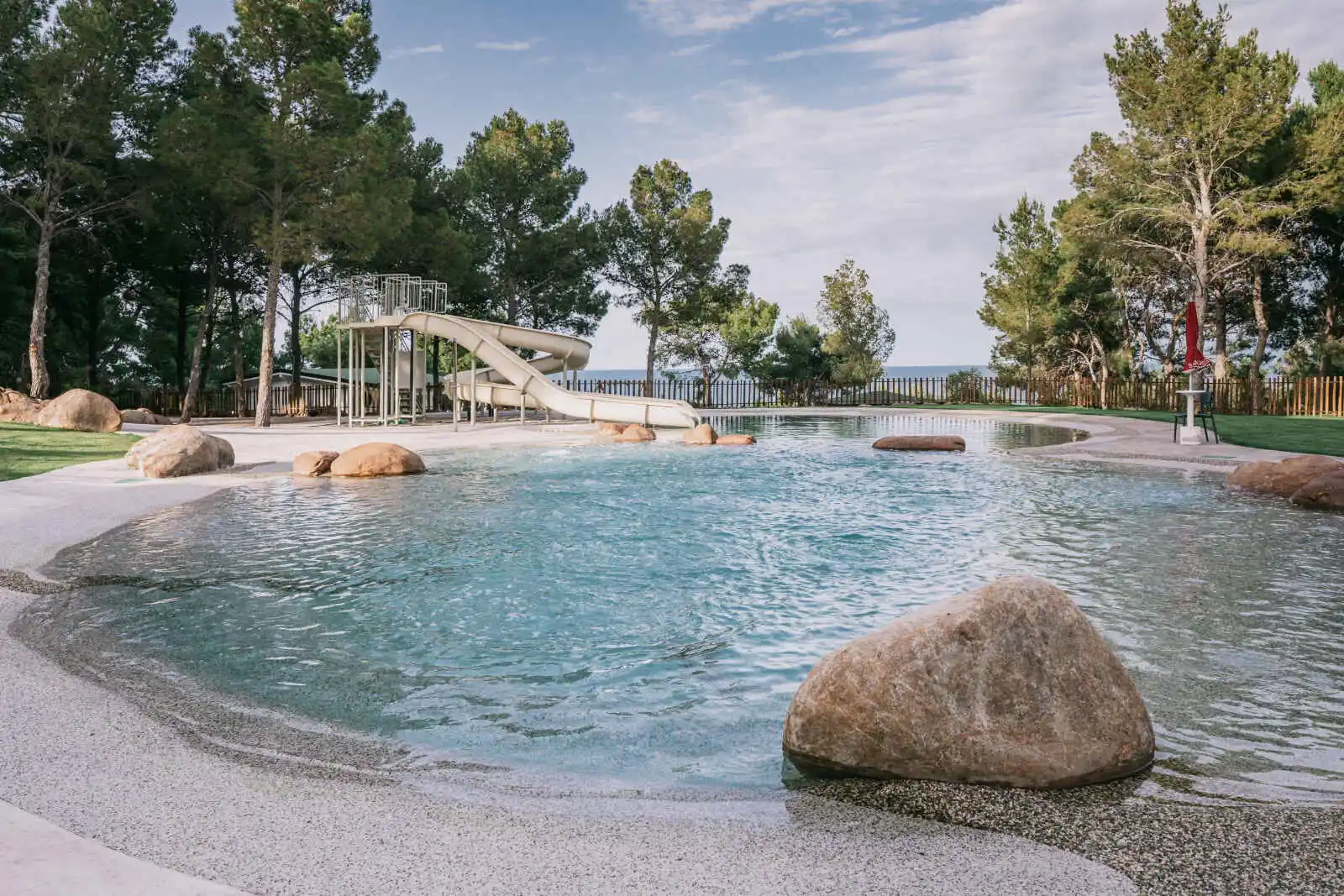 2 piscines dont une au format lagon avec toboggan, au cœur de la pinède, 4 courts de tennis, 2 terrains de tennis-padel, 1 terrain de football à 5 et une salle de sport.