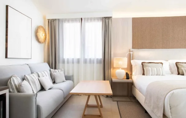 2 plages à votre disposition : la plage de l’hôtel, constituée de gros sable et rochers, est facilement accessible à pied (200 m.), ce rivage naturel aménagé de transats/parasols est appelé « Calm beach », idéal pour qui recherche la tranquillité. Une autre plage de sable à 800 mètres est desservi par une navette en période estivale. Transats non réservables à l'avance.