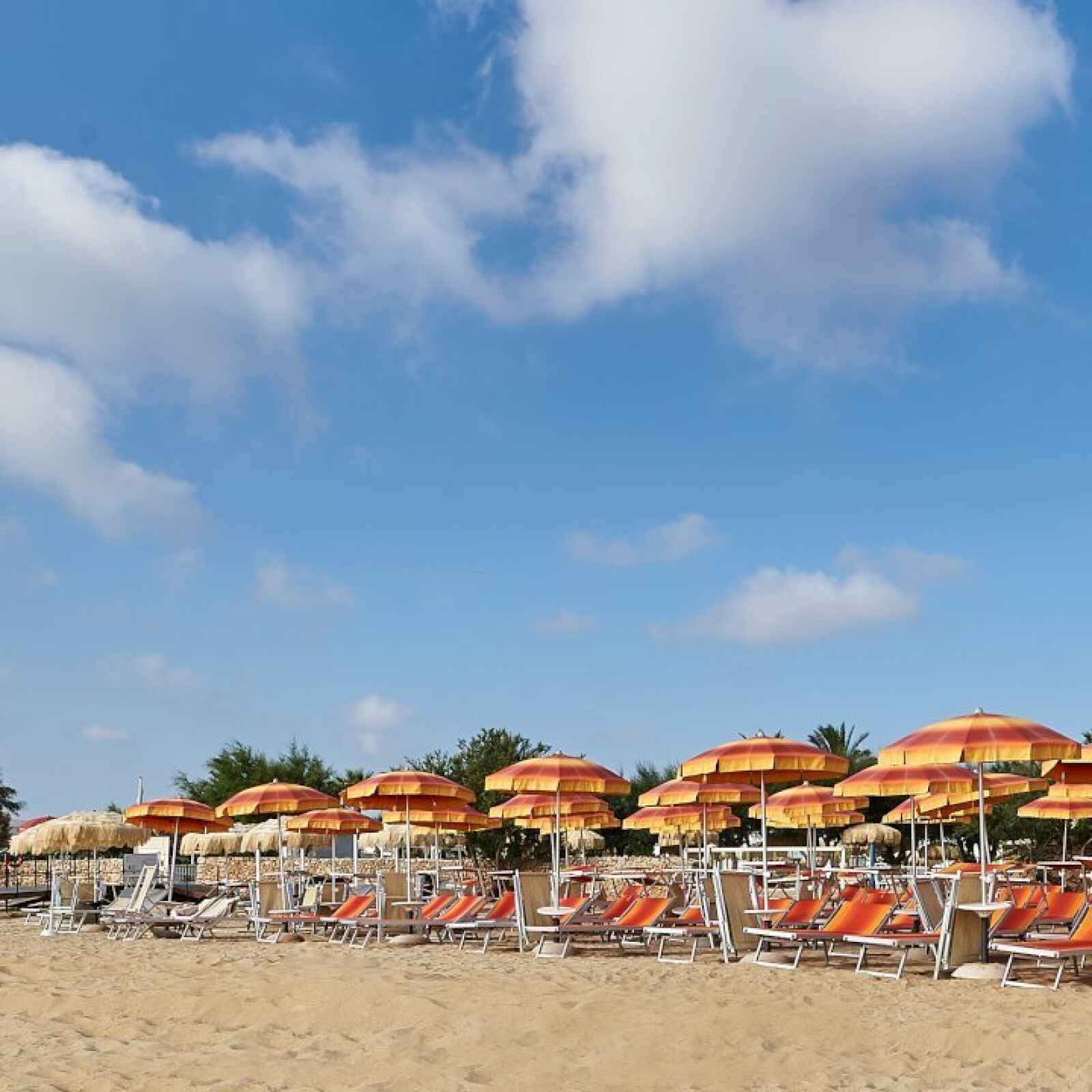 La plage de sable et galets borde une crique aux eaux cristallines riche en végétation marine (chaussons de mer recommandés). Une passerelle permet de franchir les rochers au bord. Transats et parasols en accès libre.