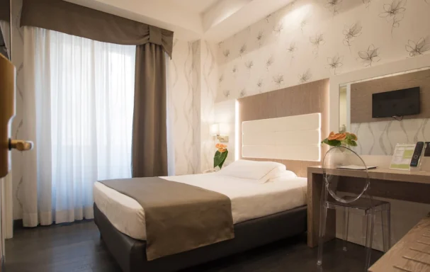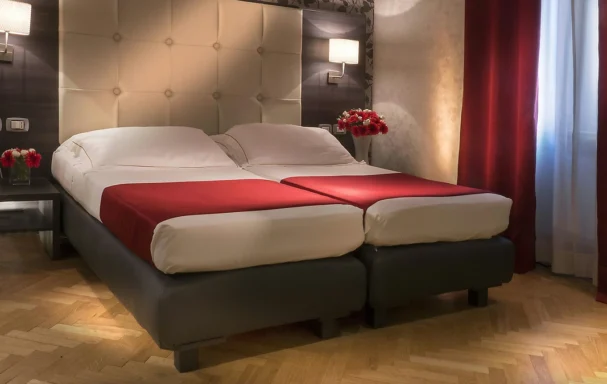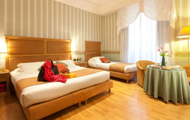 Petit déjeuner continental servi sous forme de buffet. Le restaurant de cuisine italienne L’Uliveto au 7e étage offre une vue panoramique sur les toits romains.