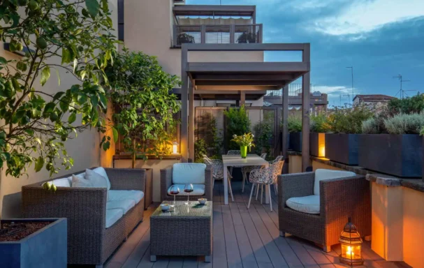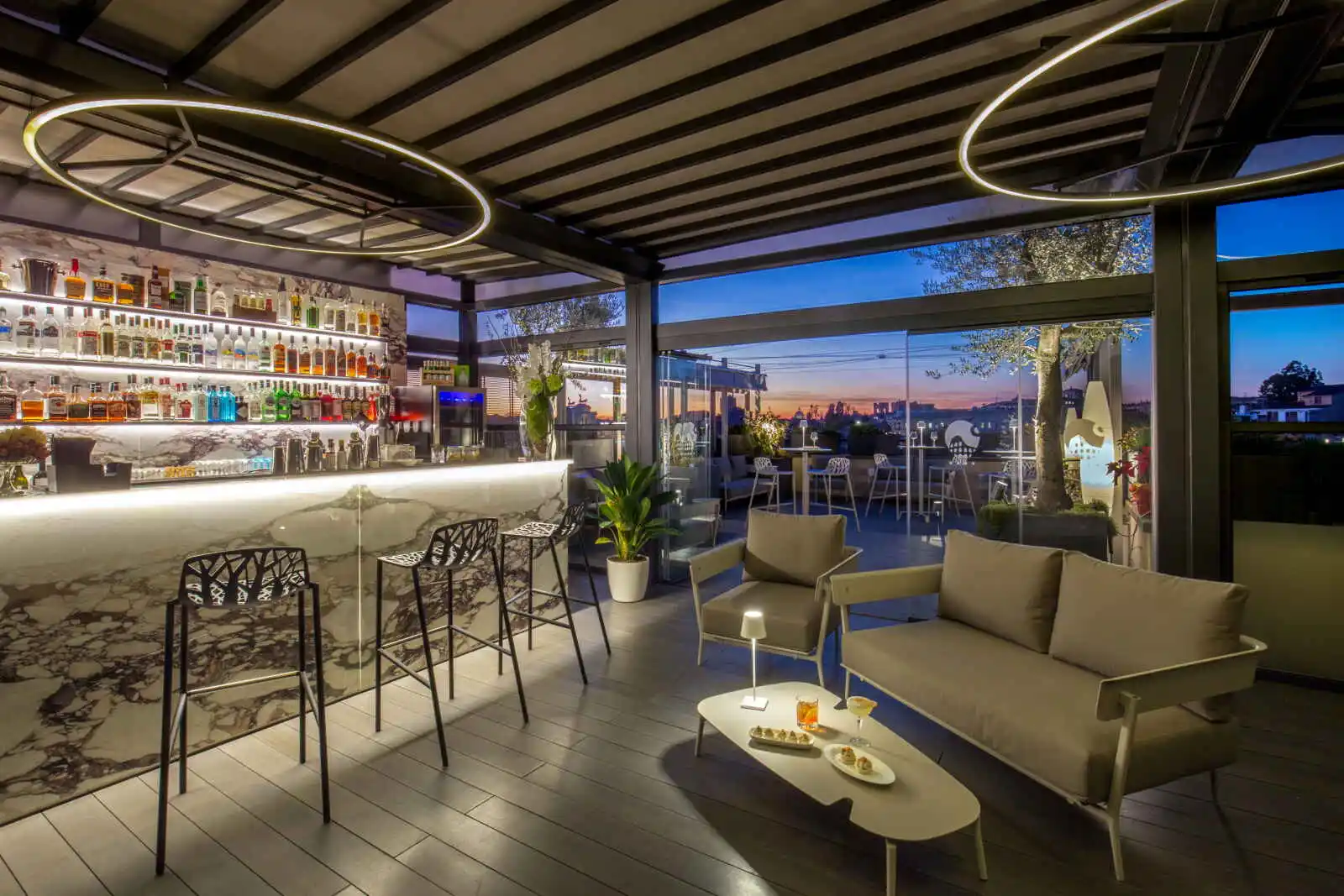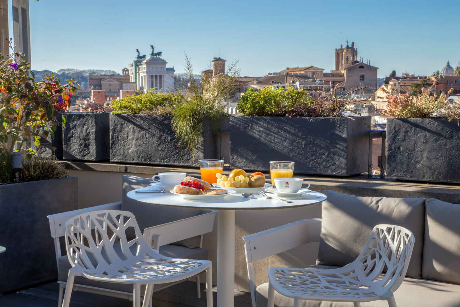 Le petit déjeuner américain est servi sous forme de buffet sur le toit-terrasse. En fin d’après-midi, cet espace se transforme en bar et offre un beau panorama sur les toits romains.